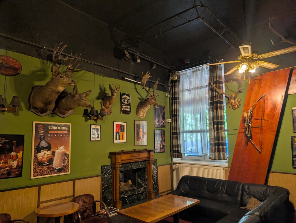 The stag trophies are looking at me with silent outrage; they didn’t choose to be here, unlike me.