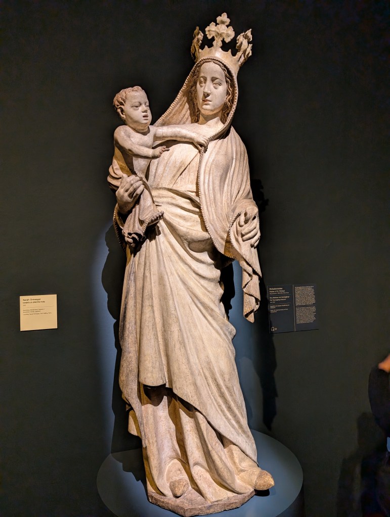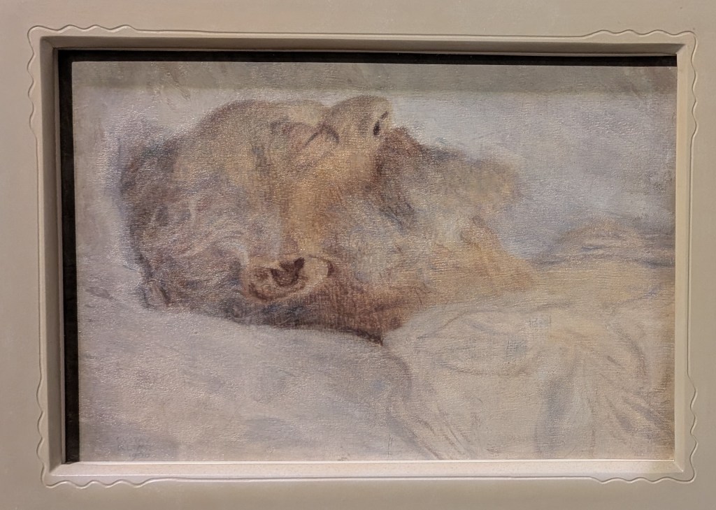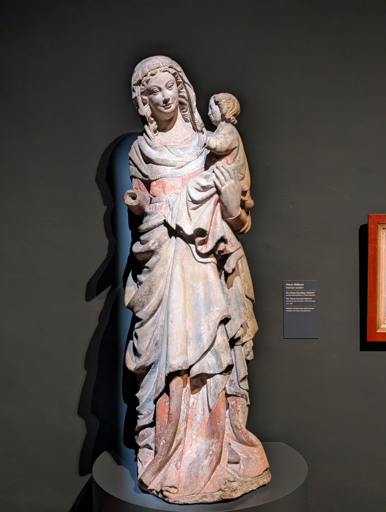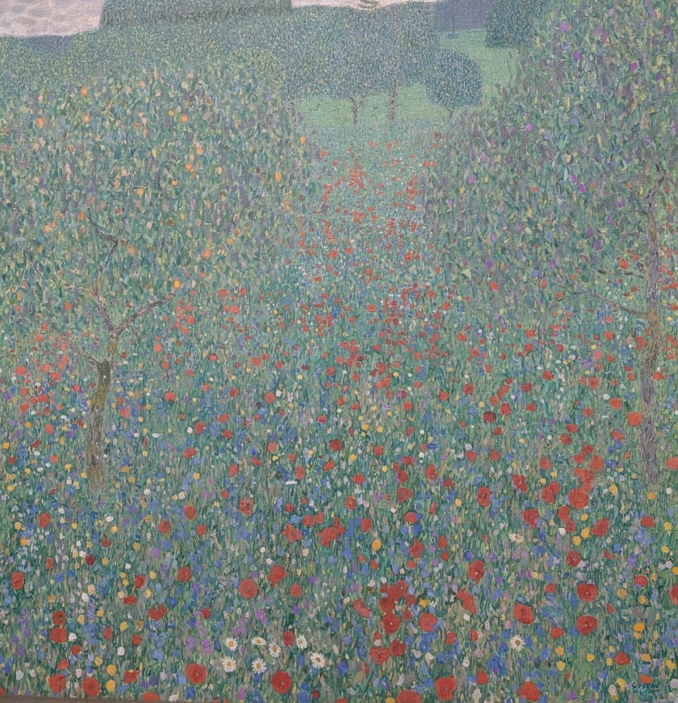 Before I get to Klimt, I have several periods and cultural movements to go through. I am starting with renaissance art, somehow bestowing me with the continuity I so badly needed after a short visit to the cathedral. I am still looking at the sacred, the Mary statues from the fourteenth century, altar doors a century younger, but still from a time when people cared a lot about art promulgating the religious message. As I progress through the halls of the museum, I see the shift happening, the sacred mixing with the profane, the religious browbeating replaced by landschafts, still life, portraits of nobles. It’s around the time when I see Path in Monet’s Garden in Giverny that my heart starts beating faster. I don’t need to convince myself of the superiority of impressionism over the Viennese secession, and since everyone is melting down in front of that one work by Klimt, I have more personal space to savour what I really enjoy. But then, even Klimt can move my heart, just not the Kiss, not this staple of every art guide; I prefer Flowering Poppies (of course!) and Old Man on His Death Bed. I feel more thematically connected to Solitude, by Mediz (as I am experiencing quite a lot of it), or to Lost by Von Stuck (so am I, in the best possible sense of the word.) A sizable portion of the collection is devoted to female artists, something that Gombrich, unlike Katy Hessel, was oblivious to. One of my exes, at least her previous incarnation under the name of Marie-Louise Von Motesiczky, is looking at me with a bit of regret.