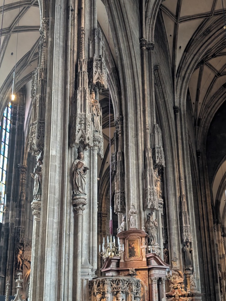And then off to the cathedral, as it is still two hours till my entrance time at the Belvedere. The church is swarming with tourists, but even with their incessant buzz, I can hear what has always been dearest to me inside any church, its acoustics, the echoing of someone’s shambling walk or the susurrus of group prayers. The Romanesque/Gothic edifice is majestic, layer after layer after layer of history, all of it accumulated in less than nine hundred years. It must be someone’s parish, and I start wondering how the parishioners deal with this constant influx of curious sightseers. It’s an insurmountable dilemma: leaving it open to the masses helps to keep it renovated, but then it’s never going to be a shelter from the spiritual storm of many a believer. St. Stephen’s is in stark contrast to my hometown’s cathedral, lesser, a bit forgotten, but giving a necessary dose of peace within its walls.