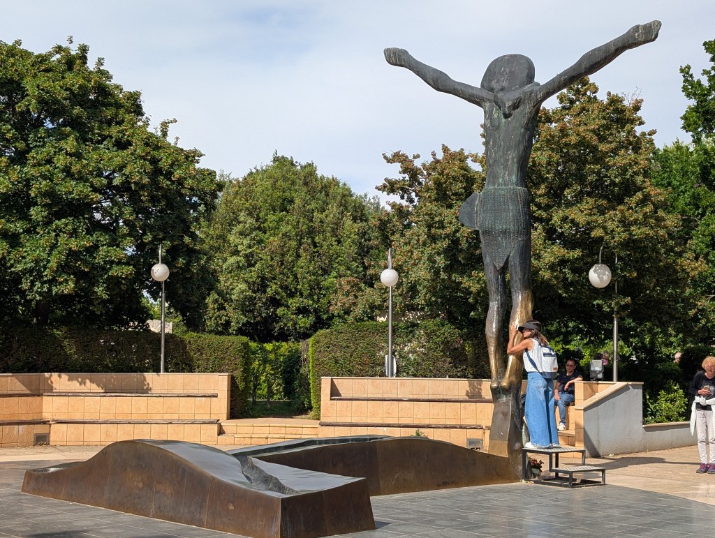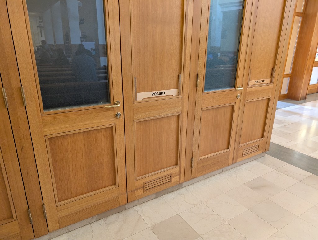 There is a statue of Christ Risen, and a queue to wash His feet. All the fourteen Stations of the Cross are hidden in the labyrinthine garden surrounding the statue. Back in the church building, I see many confession booths, most of them are labelled with Hrvatska, for Croats. There is one in English. There is one for Poles, but there’s no priest inside.