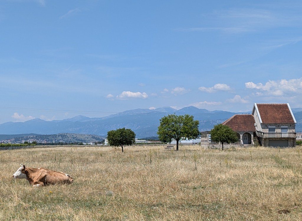 It’s between half an hour to an hour to get to the city border, and seeing how the bus is MIA, I decide to have a walk through the Montenegrin countryside. The views are excellent; there are sheep and cows grazing behind rudimentary fencing. There is a vineyard with some hillocks in the background. The dog, whom I name Ginger, is following me. Sometimes he disappears around the corner but then comes back to make sure I am still there. I guess he likes me, I guess he instinctively feels that I am a good candidate to take him in. If only I could, dog, if only I could…