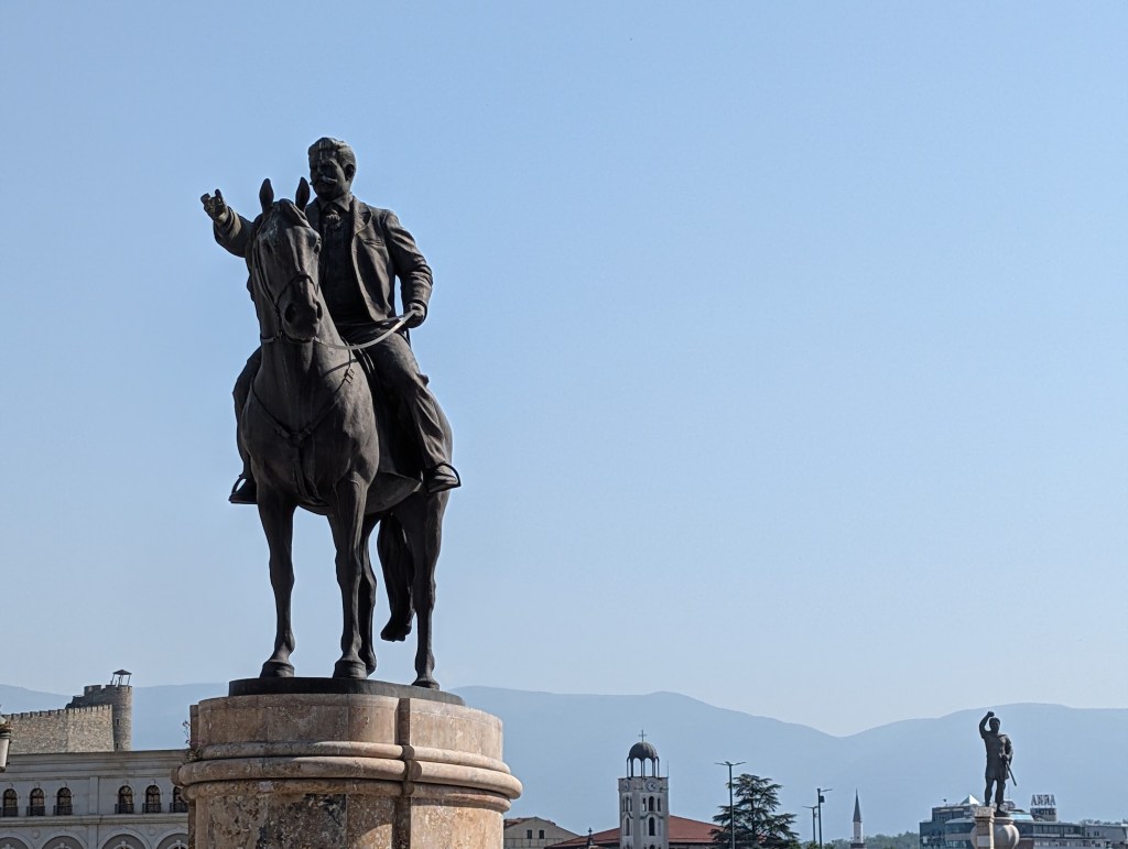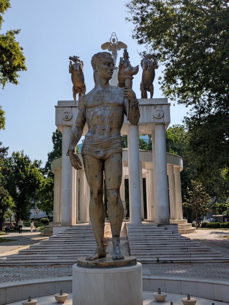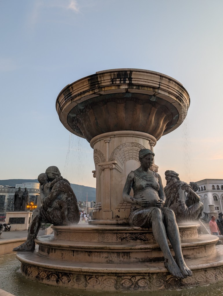 Anyway, who am I to judge? I am stuck, too. Skopje is the hottest city I’ve visited so far, so I only decide to go out in the evening. It’s almost dusk and the streets are filled with… monuments. There is one at seemingly every street corner. A horseback warrior, once educated by Aristotle, rides away to become a youthful conqueror of the known world. The animal rears, and for a moment I can almost see Alexander looking across the stone bridge, towards the fountain at which his mother Olympia nurtures the child destined for greatness…