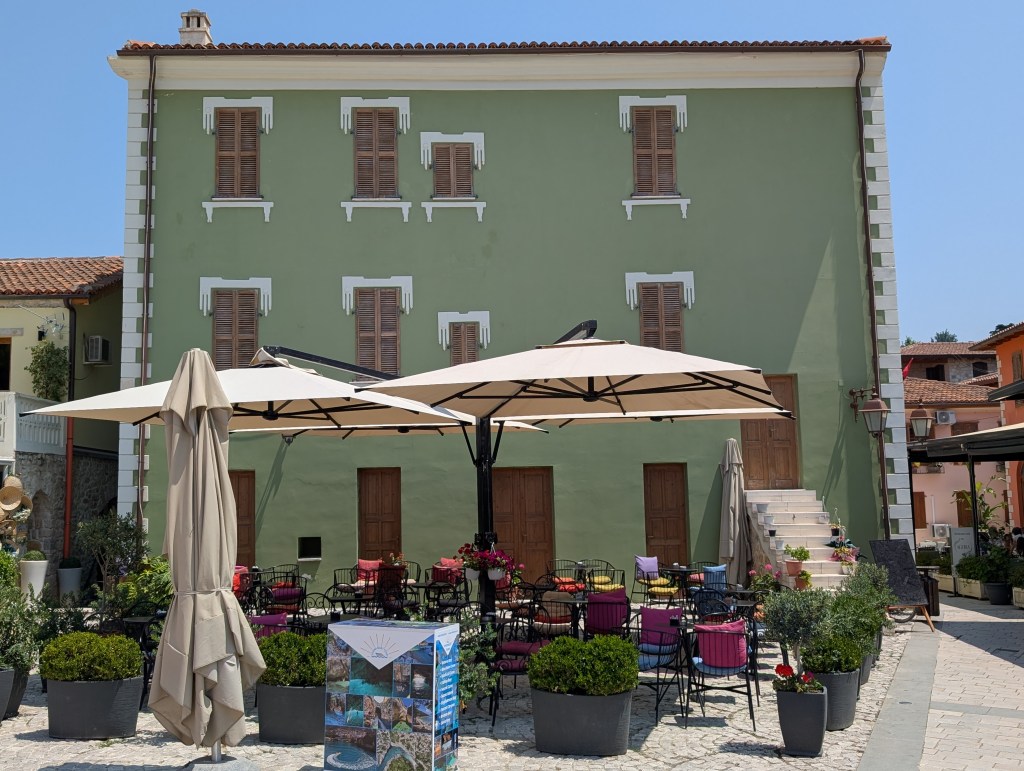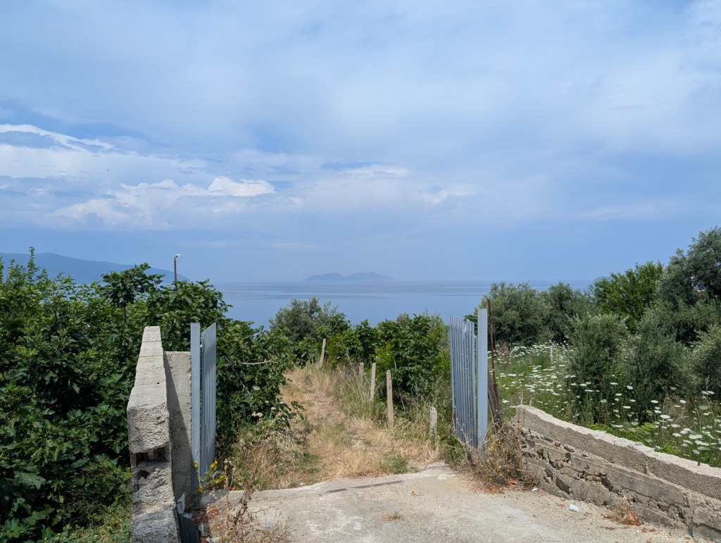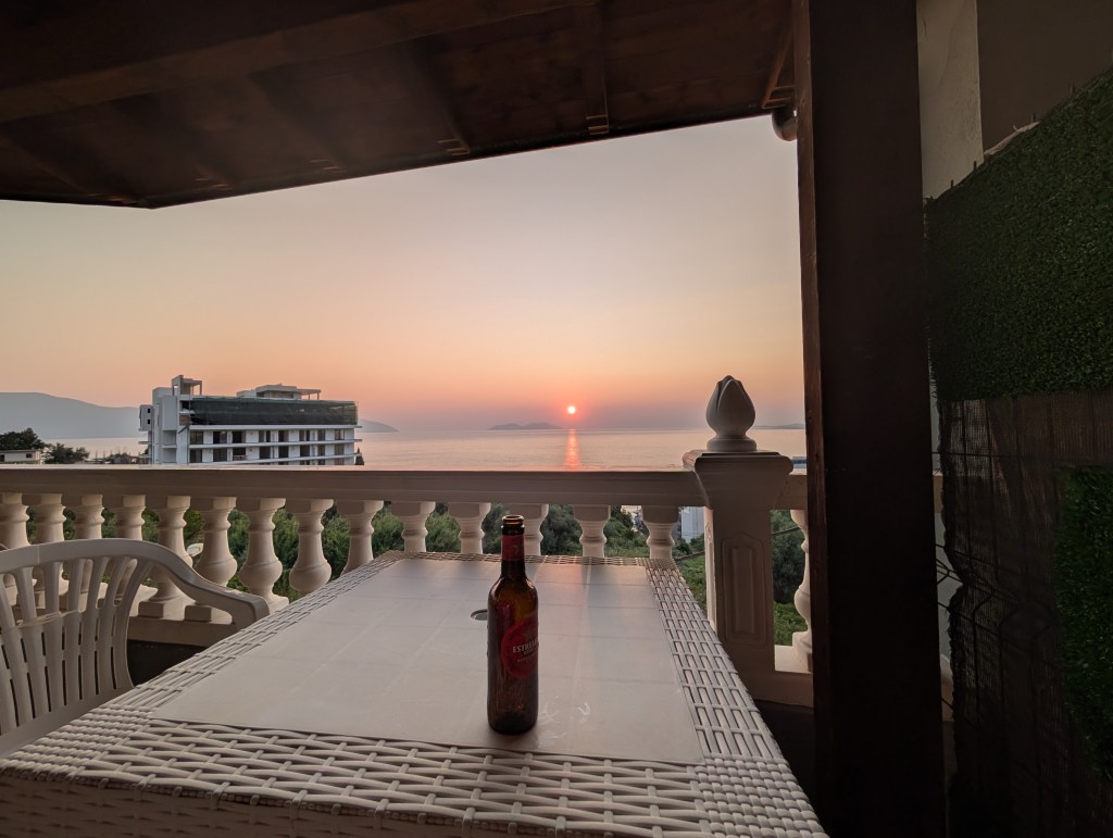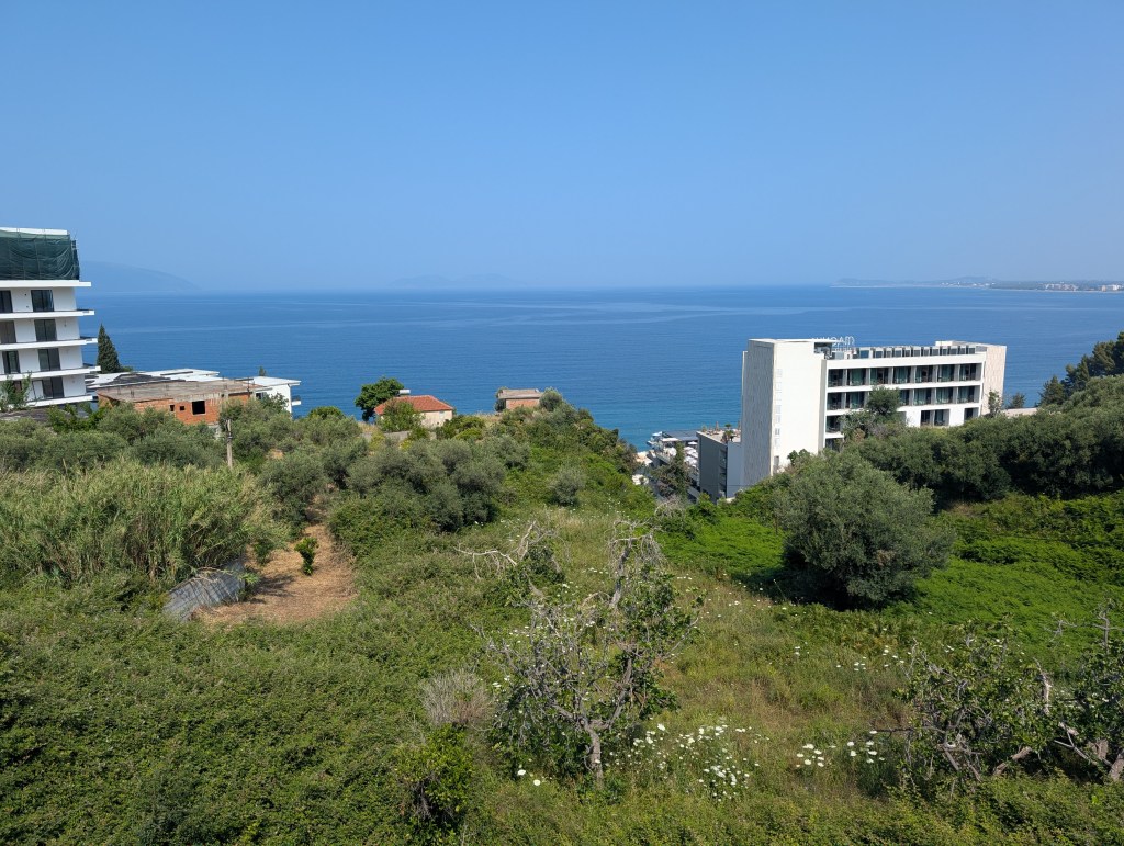 My phone with the electronic ticket displayed on the screen keeps changing hands, from a short thin man in glasses through a big jovial guy with one front tooth missing to a… little kid, barely twelve? who is more knowledgeable about smartphones than his older coworkers. The boy takes a picture of my ticket and sends it to the corpulent guy, who then sends it to a thin bespectacled guy… and I get on the van, an hour early, not too shabby. But it turns out the air conditioning doesn’t work and the vehicle is really packed, two dozen people filling the inside with carbon dioxide. By the time we get to Vlorë, we are cooked. A young backpacking couple offers to share a cab, but my hostel is way out of town, so eventually the cab is on me alone.